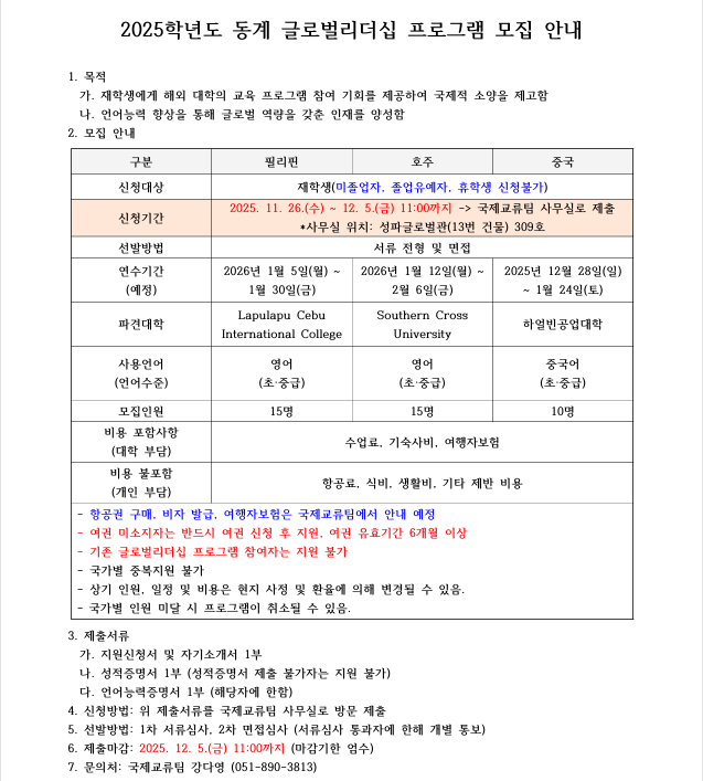 2025학년도 동계 글로벌리더십 프로그램 참가 학생 모집