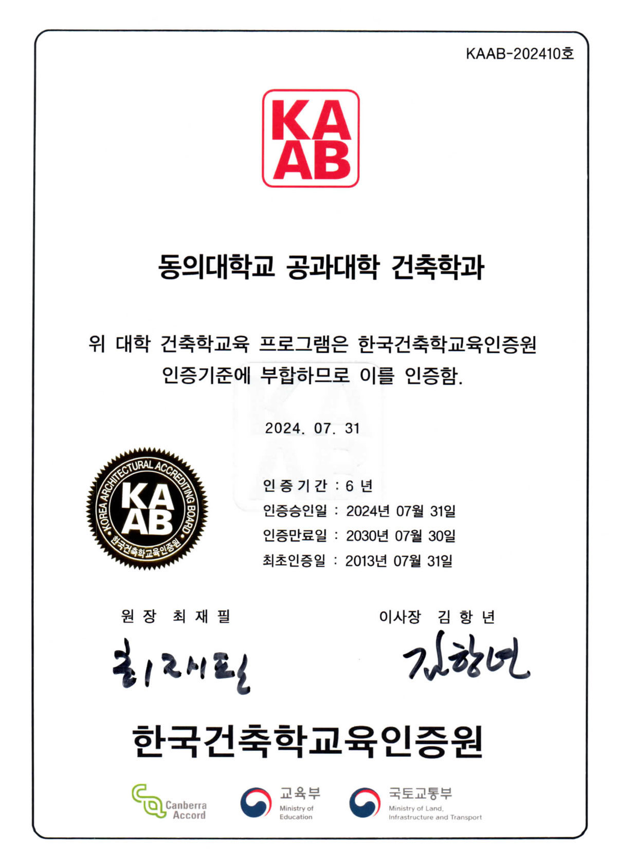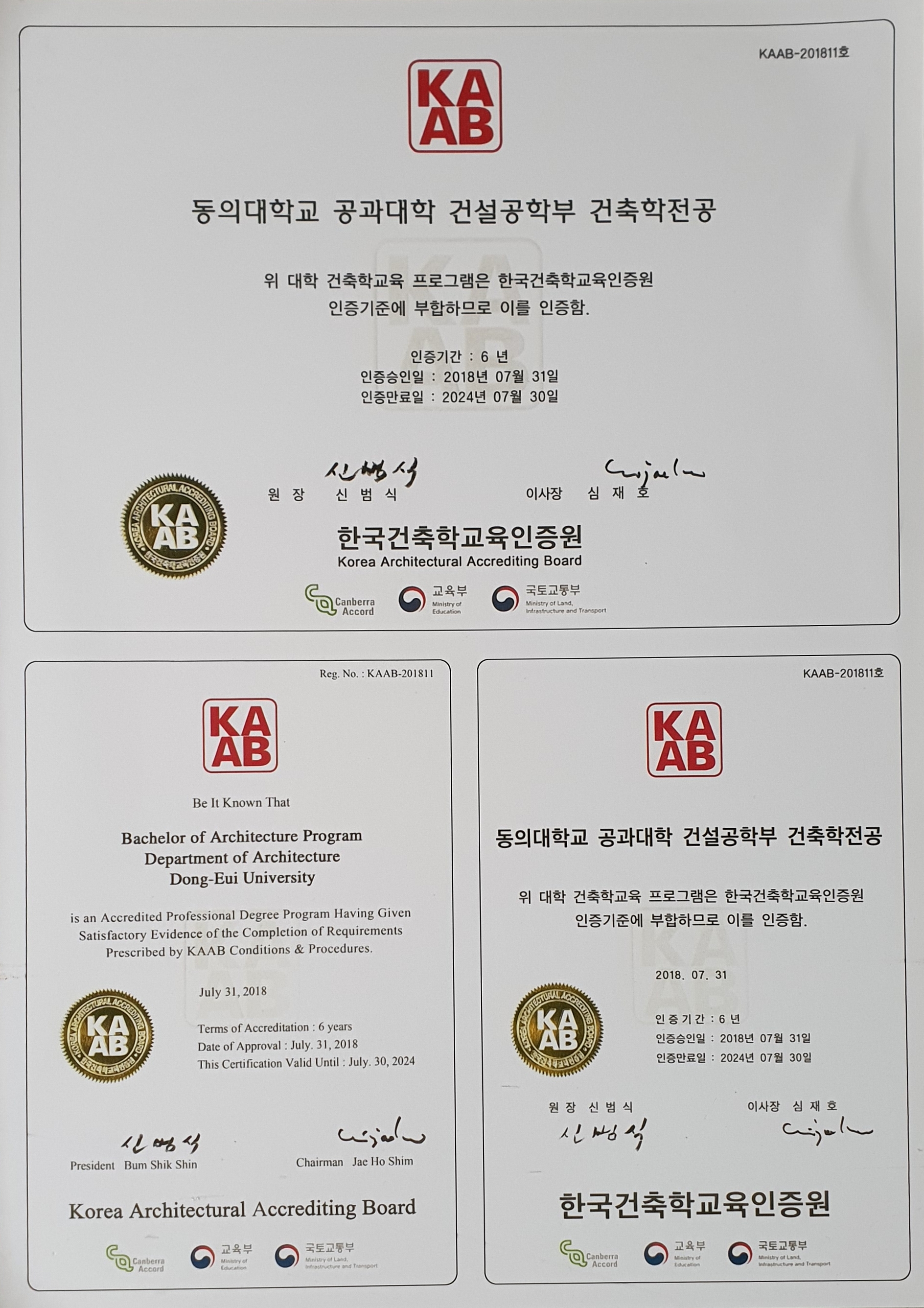 동의대학교의 건축학사학위는 한국건축학교육인증원(KAAB)이 제시하는 인증기준 및 절차를 준수하고 건축학교육 전문학위 인증을 취득한 프로그램으로서, 캔버라협약 (Canberra Accord) 회원 인증기관들과 유네스코-세계건축사연맹(UNESCO-UIA) 건축학교육인증기구(UVCAE)가 동시에 인정하는 전문학위 프로그램이다. 인증 받은 건축학교육 전문학위 취득을 건축사등록원에 등록하는 등록 건축사의 필수 자격 요건으로 명시하고 있는 것은 국제적 추세이다. (www.kaab.or.kr 참조)