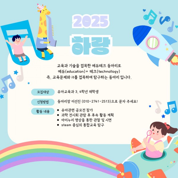‘하랑'은 유아교육과 학생들이 모여 미래 교육의 혁신을 이끌어가는 에듀테크 동아리입니다. '하랑'은 '함께 높이 날다'는 의미를 담고 있으며,