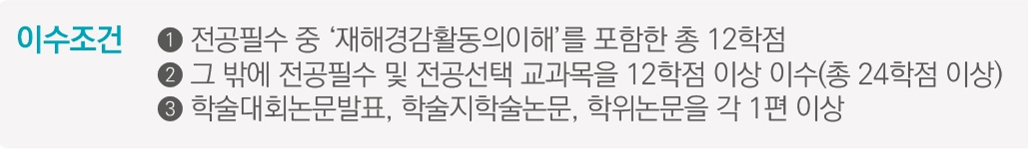 동의대학교 일반대학원 소방방재행정학과 재난관리학 전공에서는 "법·제도 중심의 재난관리 전문인력 양성"을 목표로 관련 교과정을 구성하고, 다양한 비교과 체험을 통하여 다양한 현장에서 종합적인 대응 역량을 갖춘 전문가를 양성하고자 노력하고 있습니다.