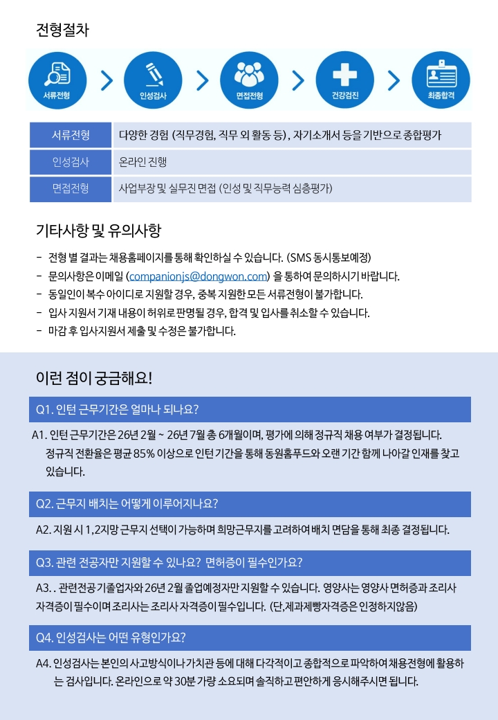 [취업] 동원홈푸드 2026 상반기 정규직 전환형 인턴조리사/인턴영양사 공채