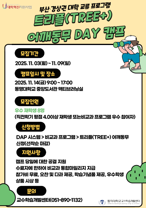 교수학습개발센터의 학습지원 프로그램인 2025학년도 트리플(TREE+) 어깨동무 캠프 프로그램을 안내하오니 학생들이 신청할 수 있도록 홍보 부탁드립니다.