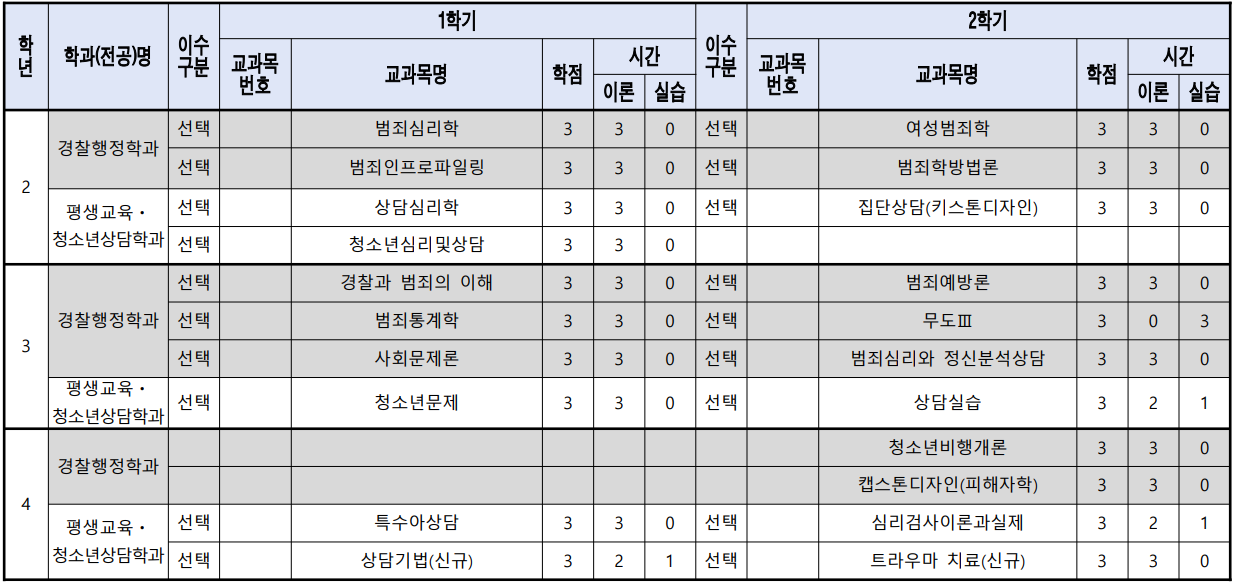 - 주요 관련 교과목 :[평생교육ㆍ청소년상담학과] 상담심리학, 청소년 심리 및 상담, 집단상담, 청소년문 제, 범죄심리와 정신분석상담, 상담실습, 심리검사 이론과 실제, 트라우마 치료/[경찰행정학과] 범죄심 리학, 범죄인 프로파일링, 여성범죄학, 범죄학방법론, 사회문제론, 범죄예방론, 청소년비행개론, 피해자 학
