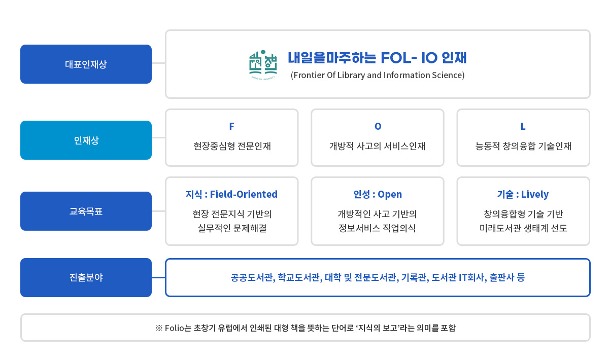 동의대학교 문헌정보학과는 “미래 문헌정보학 분야의 선두주자”라는 의미로 “내일을 마주하는 FOLIO(Frontier Of Library and InfOrmation Science) 인재”를 학과 인재상으로 설정하여 빠르게 변화하는 도서관 및 관련 현장의 환경에 능동적이고 진취적으로 도전하는 인재를 양성하고자 합니다.