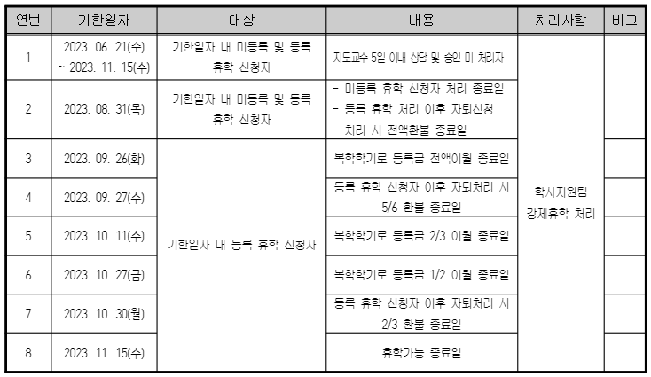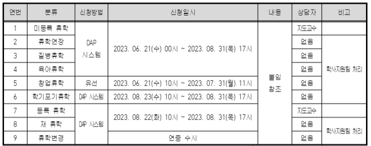 2023학년도 2학기 휴학 및 휴학연장 일정 및 내용 통보