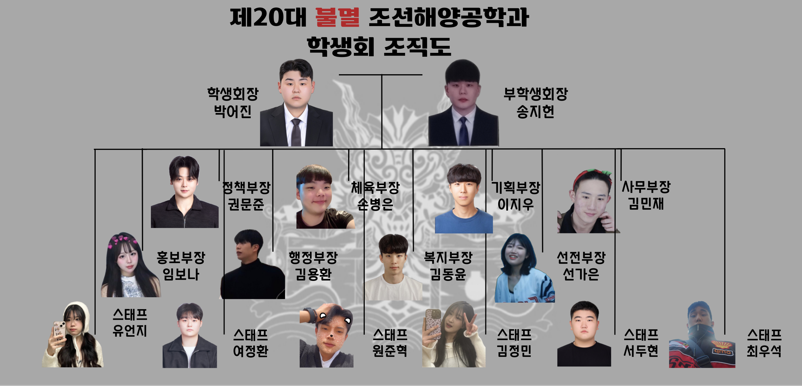 비전을 제시하고 열린마음으로 변화와 혁신을 주도하는 조선해양공학과 학생회는 선후배 간의 자유로운 분위기를 바탕으로, 학과비전에 맞게 선박해양관련 첨단기술선도를 장려하는데 최선을 다하고 있습니다. 취업준비에 만전을 기하고자 노력하고 있으며, 또한 학과 구성원들이 알찬 대학생활을 할 수 있도록 다양한 문화활동과 창작활동을 지원하고 있습니다.