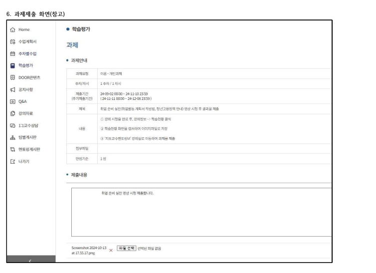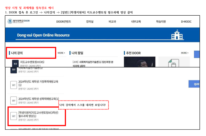 1학년 | ‘진로 로드맵 및 개인별 포트폴리오 작성‘ 영상 시청 | ① DOOR(door.deu.ac.kr) 로그인 ② 메인화면의 나의 강의 목록⇨[일반]‘[학생지원처]지도교수멘토링Ⅱ(1학년) 필수과제 영상‘ 클릭 ③ 1주차 1차시 영상(진로 로드맵 개인별 포트폴리오 작성) 수업보기 클릭 후 시청 | ① 강의 시청 완료 후, 주차별수업 내역 화면캡처하여 이미지파일로 저장 ② DOOR 메인화면 나의강의⇨[정규]지도교수멘토링Ⅱ 클릭 ③ 학습평가⇨과제에서 결과물제출 클릭하여 과제제출 |