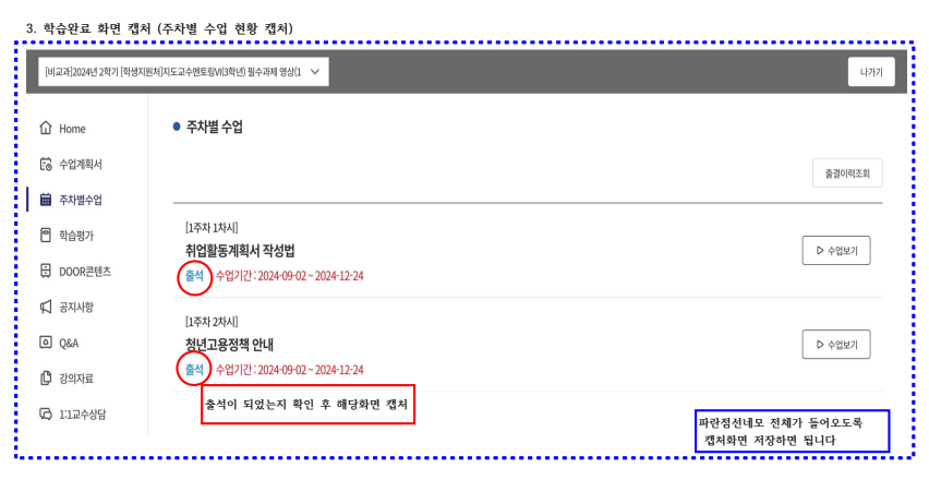 3학년 | 취업 준비 실전 영상(취업활동계획서 작성법 등) 시청 및 결과 제출 | ① 학습현황캡쳐 | ~12.08.(일) |