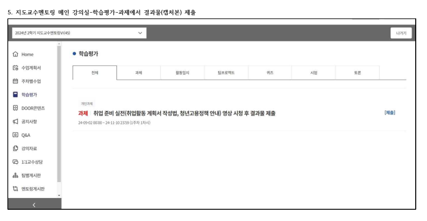 3학년 | ‘취업활동계획서 작성법’ 또는 ‘청년고용정책 안내’ 영상 시청 | ① DOOR(door.deu.ac.kr) 로그인 ② 메인화면의 나의 강의 목록⇨ [일반]‘[학생지원처]지도교수멘토링Ⅵ(3학년) 필수과제 영상‘ 클릭 ③ 1주차 1차시 영상(취업활동계획서 작성법 또는 청년고용정책 안내) 수업보기 클릭 후 시청 | ① 강의 시청 완료 후, 주차별수업 내역 화면캡처하여 이미지파일로 저장 ② DOOR 메인화면 나의강의⇨[정규]지도교수멘토링Ⅵ 클릭 ③ 학습평가⇨과제에서 결과물제출 클릭하여 과제제출 |