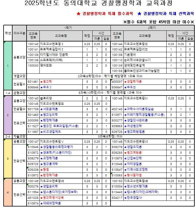 경찰행정의 본질, 경찰행정학의 발전과정, 각국의 경찰조직, 경찰인사행정, 경찰조직관리, 경찰재무관리 등 경찰행정학 전반에 관하여 기본적인 지식을 습득시킴으로써 경찰행정학 분야의 총체적인 내용을 다루는 교과목입니다. - 무도 Ⅰ(Judo Ⅰ) - 1학년
