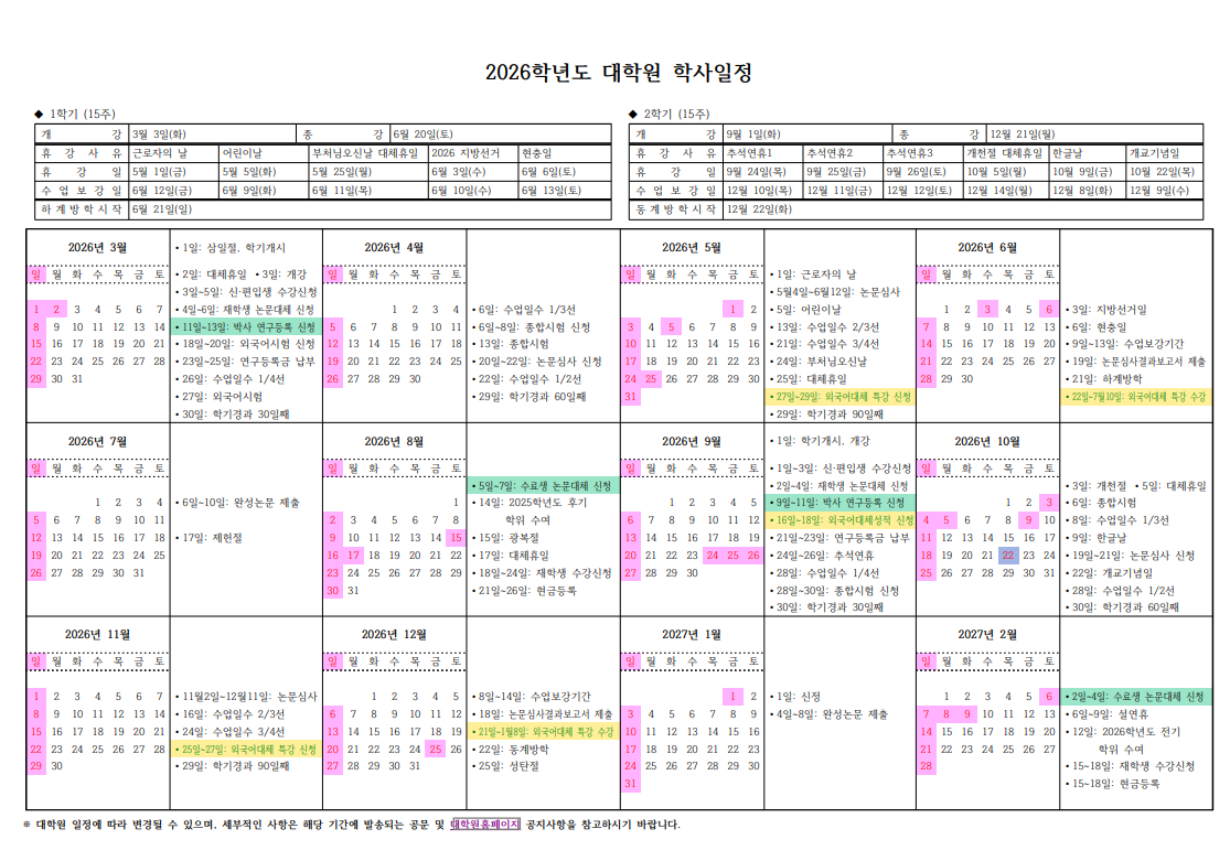 2026학년도 대학원 학사일정 확정 및 알림