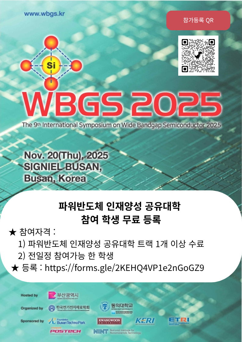 파워반도체 인재양성 공유대학 학생들을 대상으로 전력반도체 관련 국제 심포지움인 "WBGS 2025" 에 무료 등록을 지원하고있습니다.