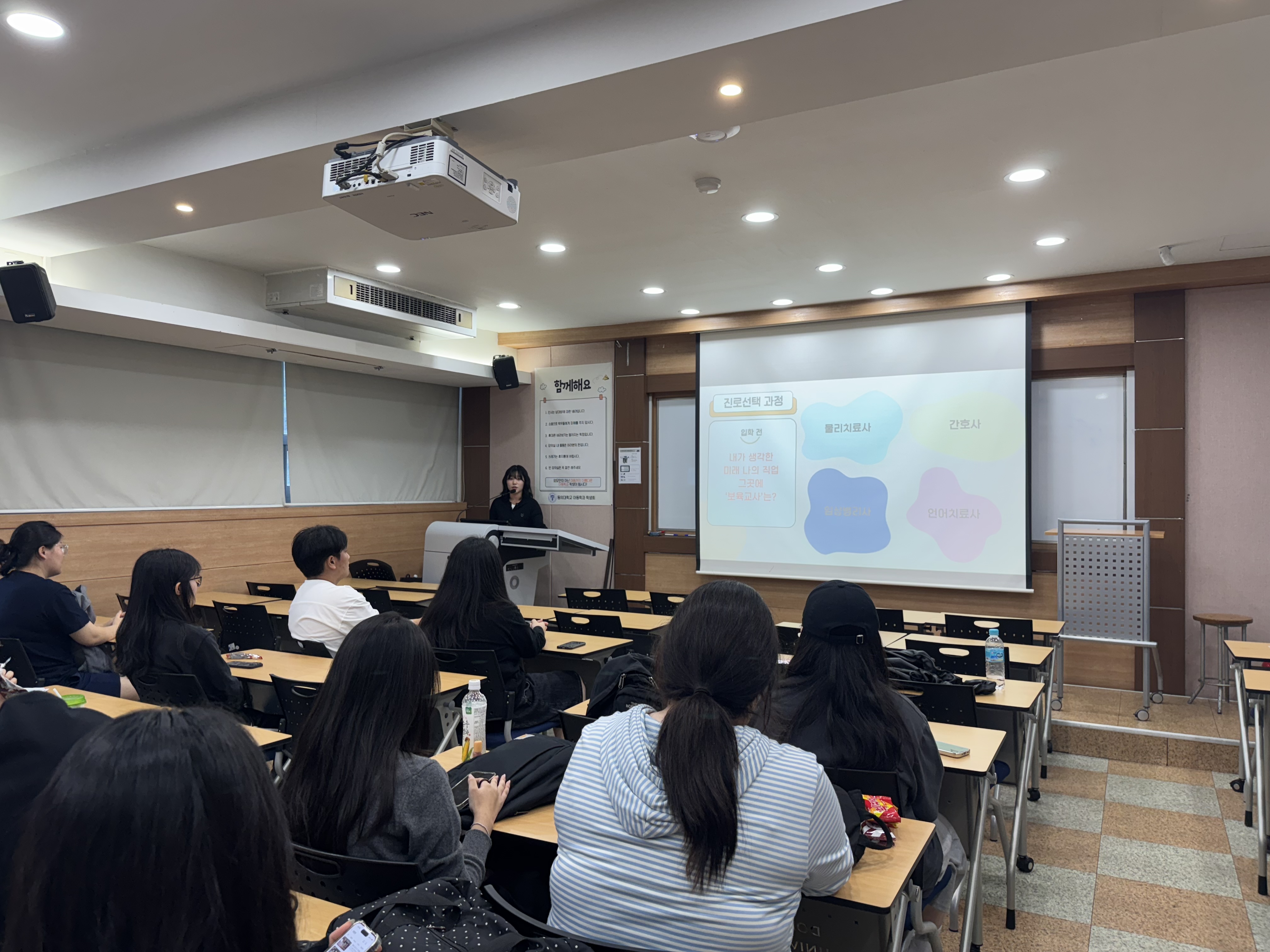 이번 프로그램에서는 한국석유공사돌고래어린이집 김현아 선생님께서 직접 참여하여 어린이집 현황과 푸르니보육지원재단의 보육프로그램 실천 사례를 소개하고, 학과 입학 후 코로나 팬데믹으로 겪은 어려움과 이를 극복한 경험을 공유하였습니다. 또한 봉사, 근로, 실습, 학술제, 연구 활동 등 다양한 경험을 통해 자신의 역량을 강화한 사례를 나누며, 주어진 기회를 적극적으로 도전하고 열정적으로 활용하는 자세의 중요성을 강조했습니다. 재학생들은 선배의 실제 경험과 조언을 통해 진로와 취업 준비에 대한 구체적인 인사이트를 얻고, 학부 시절 다양한 활동의 중요성을 다시 한 번 인식하는 뜻깊은 시간을 가졌습니다.
