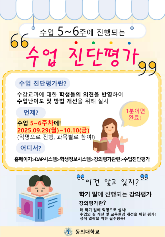 2025학년도 2학기 수업진단평가를 다음과 같이 실시하고자 하오니, 학생분들께서는 수업진단평가에 참여하여 주시기 바랍니다.