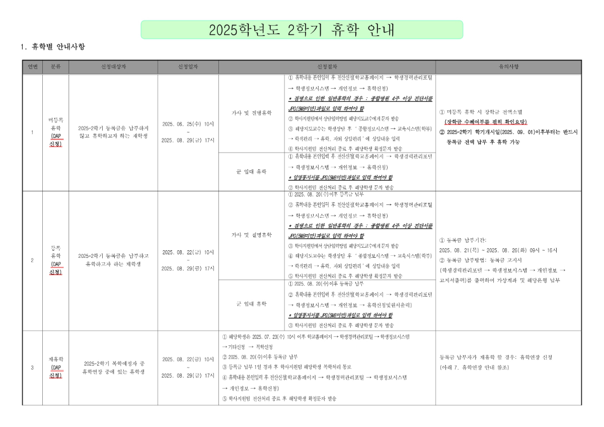 2025학년도 2학기 휴학 및 휴학연장 일정 및 내용 안내