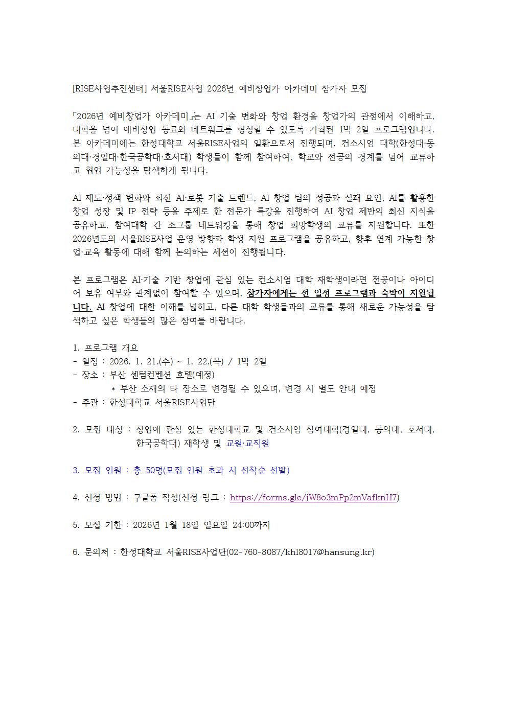 [RISE] 2026년 예비창업가 아카데미 참가자 모집 안내