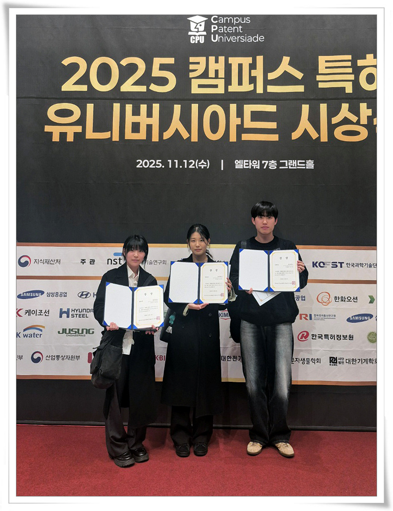 화학공학과 4학년 조누리, 김민성, 박재은 씨로 구성된 요화정 팀(지도교수 양진경)이 지난 11월 12일 서울 서초구 엘타워에서 진행된 ‘2025 캠퍼스 특허 유니버시아드 시상식’에서 장려상을 수상했다.