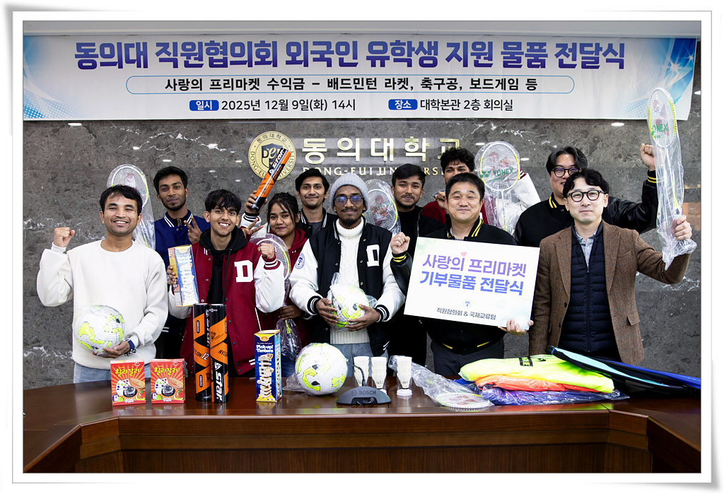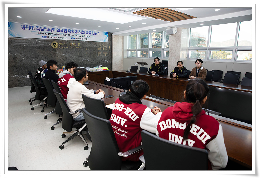 동의대 직원협의회(회장 김태훈)는 12월 9일 본관 2층 회의실에서 외국인 유학생 회장단에게 캠퍼스 생활 적응을 돕기 위한 운동용품 등을 선물로 기증했다.